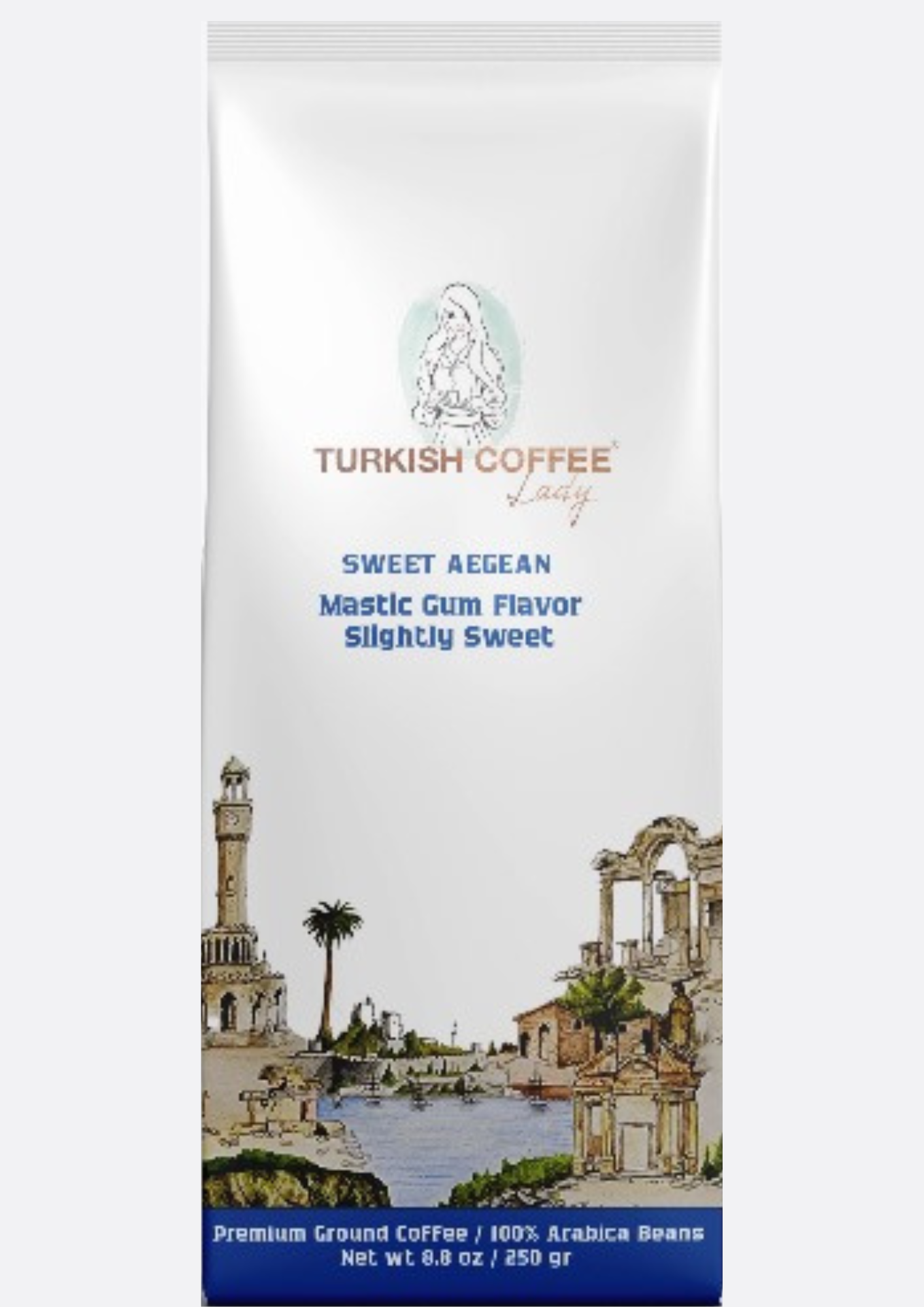 Our Aegean gourmet blend with mastic gum is a medium roast and 100% Arabica finely ground coffee. Mastic coffee's syrup is a natural flavor obtained from the mastic tree specific to the Aegean region.