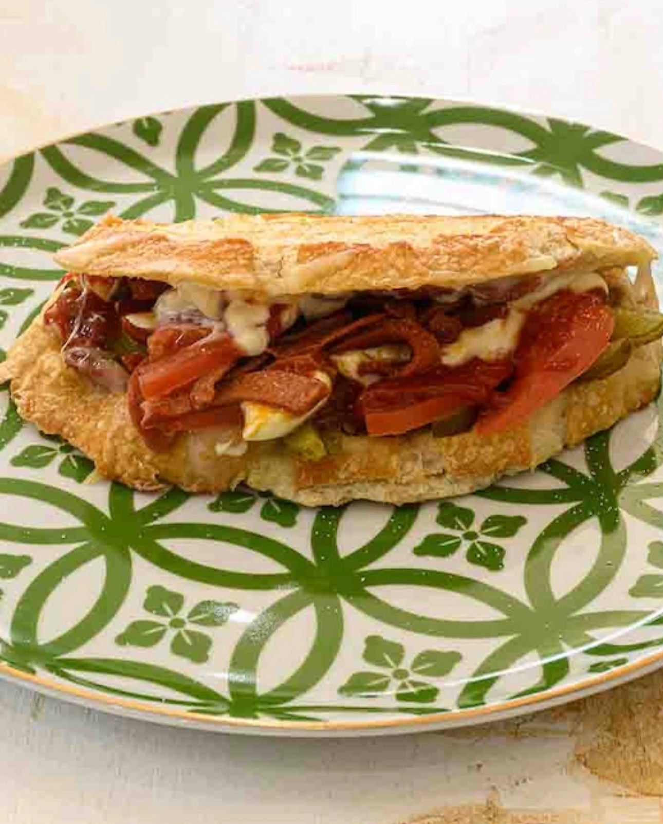 Our toast with salami & cheese is a quick and savory treat, featuring crispy bread toasted to perfection and topped with savory salami and melty cheese, providing a satisfying and flavorful bite.